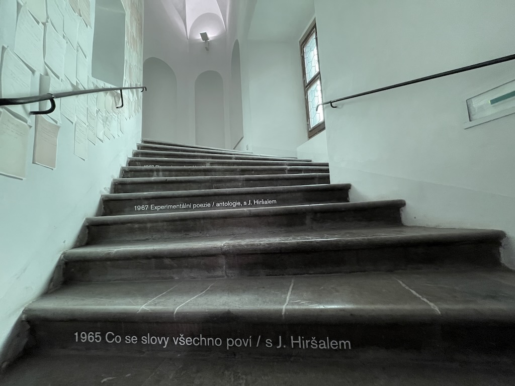 Zajímavě udělaná prezentace je umístěna ve dvou patrech a v několika místnostech ji procházíte s baterkou v ruce. Můžete se seznamovat se střípky ze života básnířky, s jejími vztahy s básníkem a překladatelem Josefem Hiršalem, rakouskou básnířkou Friederike Mayröcker, rakouským básníkem a spisovatelem Ernstem Jandlem nebo českou výtvarnicí a fotografkou Bělou Kolářovou.