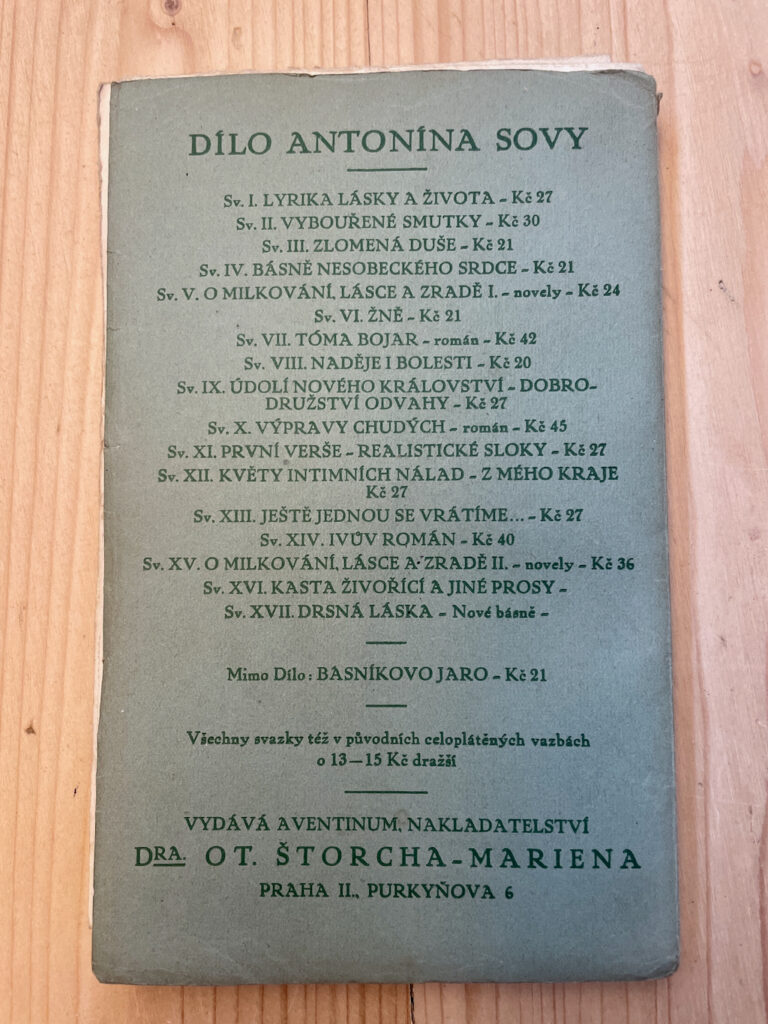 Básně s básníkem Antonínem Sovou jsem vybral ze sbírky Drsná láska, vydalo nakladatelství Aventinum v roce 1927.