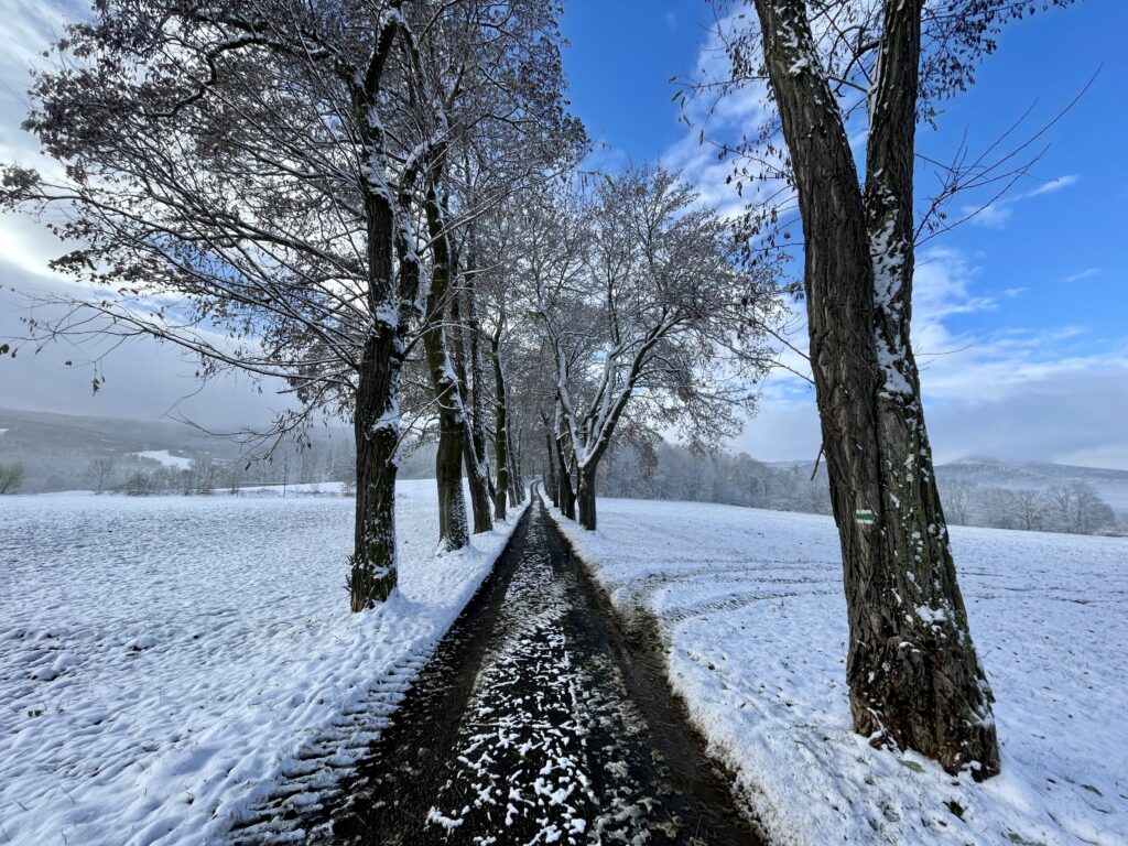 Zasněžená cesta ke kostelu Narození Panny Marie ve Strašíně u Sušice pro mě představuje jeden z prvních krásných zážitků letošní zimy. Místo, kde žil básník František Daniel Merth, je pro mě hodně inspirující. Navštívil jsem ho na jaře a energie nejen poetická z něj přímo sálá. Zúčastnil jsem se Antonínem Petruželkou zorganizovaného čtení Merthových básní a bylo to úžasné.