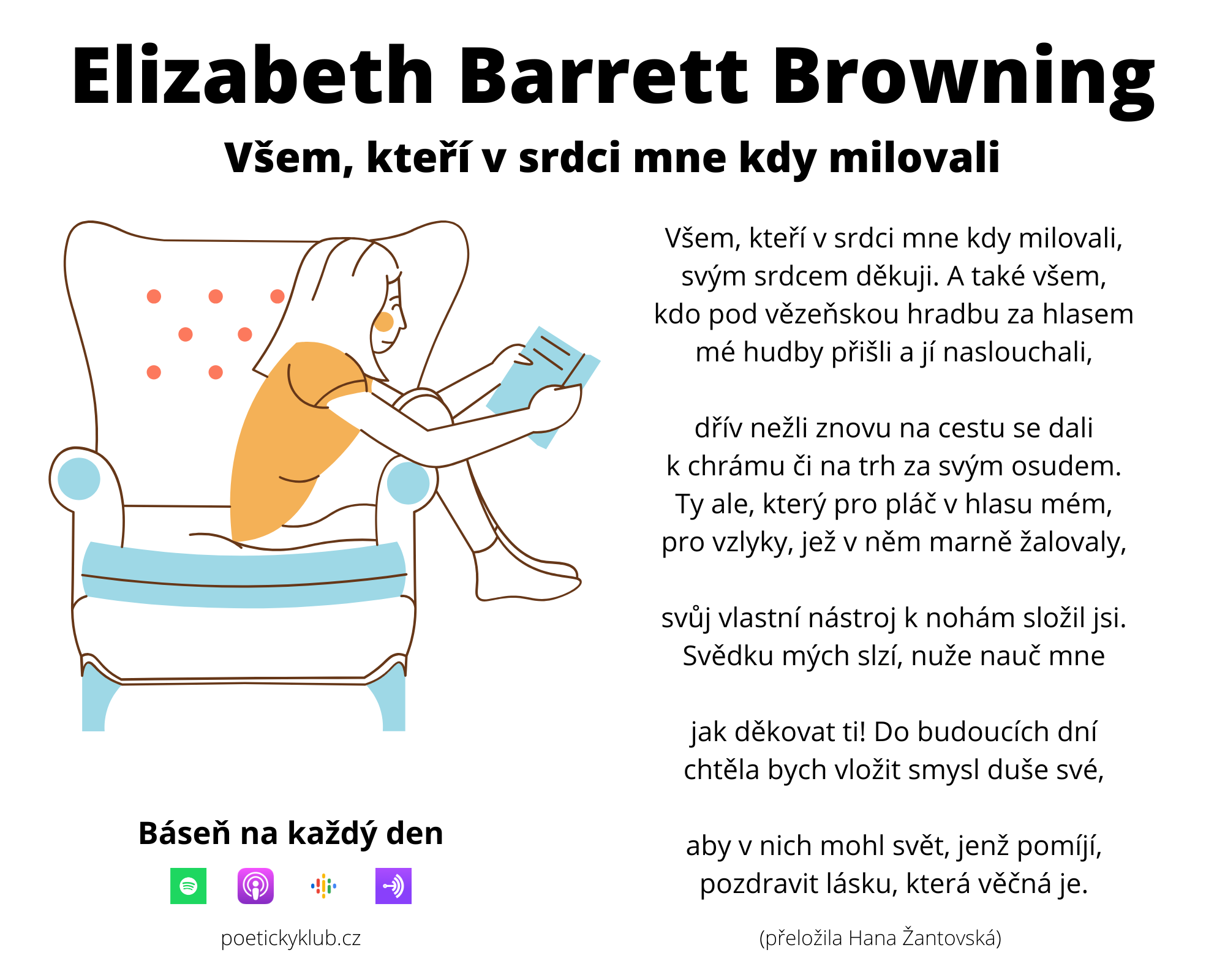 Newslettery a novinky na ➤ [https://poetickyklub.notion.site/Poetick-klub-newsletter-3154124c83fb809785c3e5f99aa6dc98?pvs=74](https://www.notion.so/Poetick-klub-newsletter-a-novinky-3154124c83fb809785c3e5f99aa6dc98?pvs=21)Podpořit činnost Poetického klubu můžete na ➤ https://www.poetickyklub.cz/podporanebo na Ko-fi ➤ https://ko-fi.com/poetickyklubnebo na Forendors ➤ https://www.forendors.cz/poetickyklubPodcasty „Báseň na každý den“ a „Poetický klub“ poslouchejte na Spotify, Apple, Google, YouRadio, České Podcasty nebo Audiolibrix.Domovská stránka podcastu je na ➤ [https://www.poetickyklub.cz](https://www.poetickyklub.cz/)Odebírejte novinky Poetického klubu do e-mailu ➤ https://www.poetickyklub.cz/novinky-poetickeho-klubu